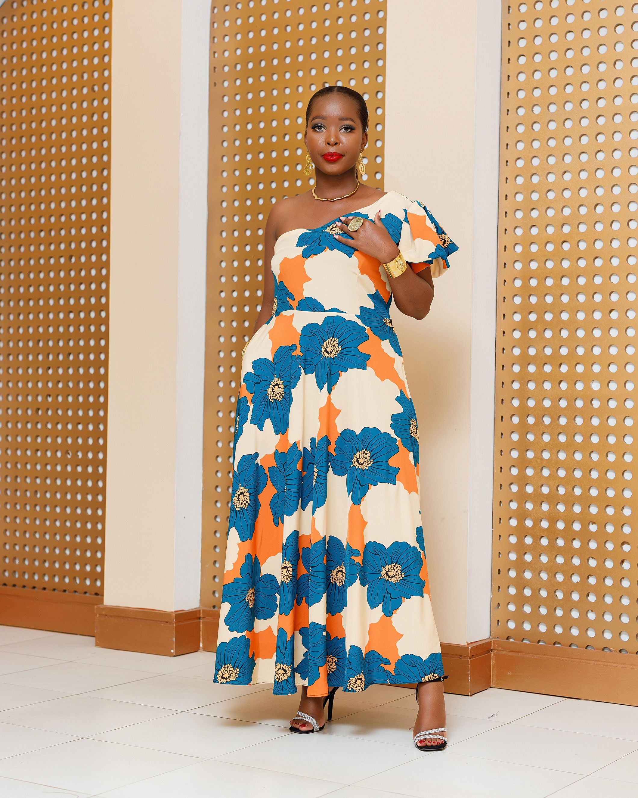 • A striking one-hand maxi dress that blends sophistication with modern flair. This asymmetrical design features a single shoulder strap, gracefully sweeping across the collarbone to highlight the neckline and shoulders. The bodice is tailored to contour the torso, offering a sleek and flattering silhouette. Flowing from the waist, the full-length skirt cascades to the floor in soft, fluid layers—creating dramatic movement with every step. Made from floral chiffon, the dress offers both comfort and glamour. Perfect for evening events, weddings, or upscale occasions, this piece exudes confidence and elegance with a touch of boldness.