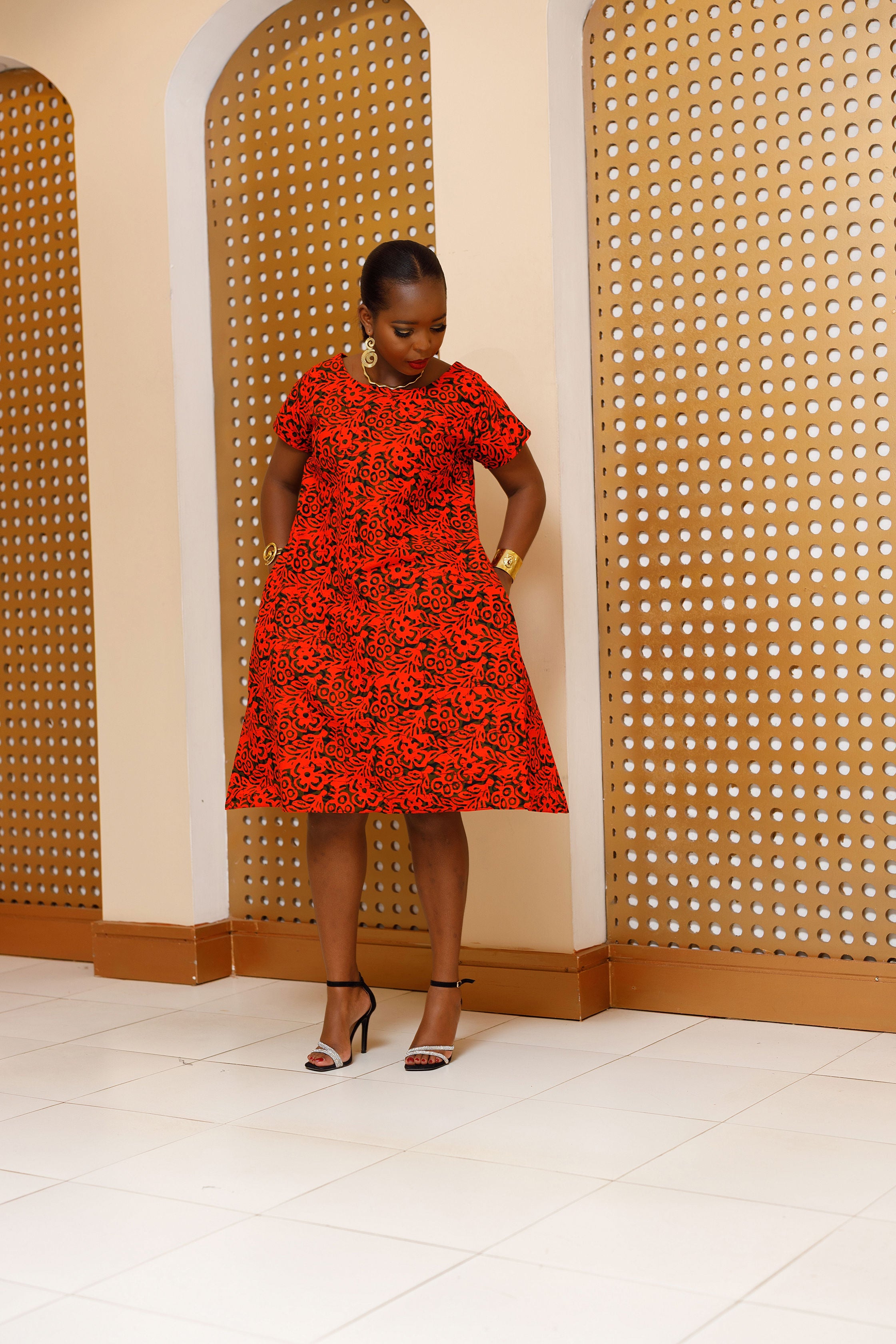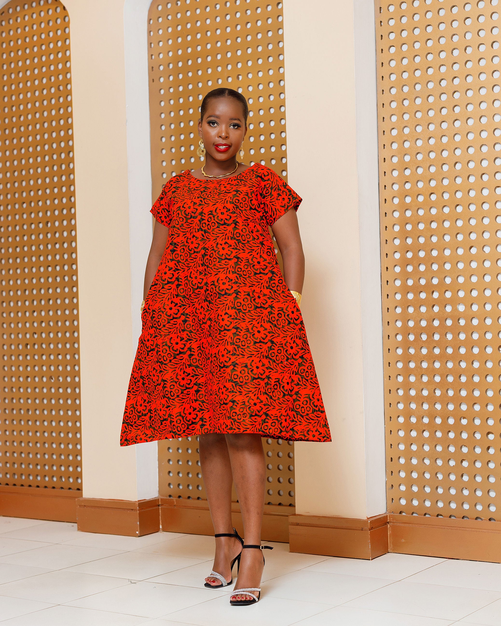 Emunali Ankara Knee Dress - Red