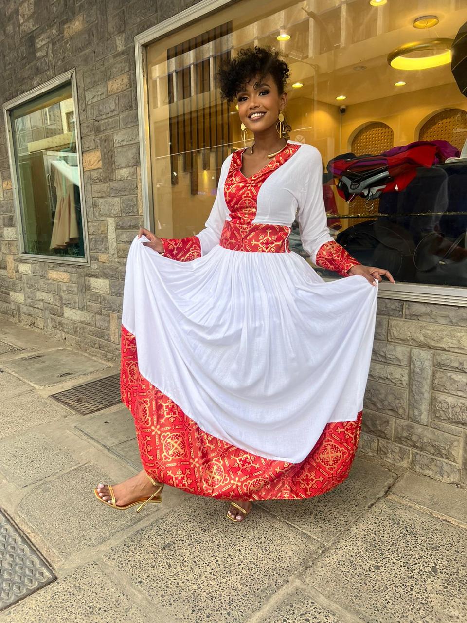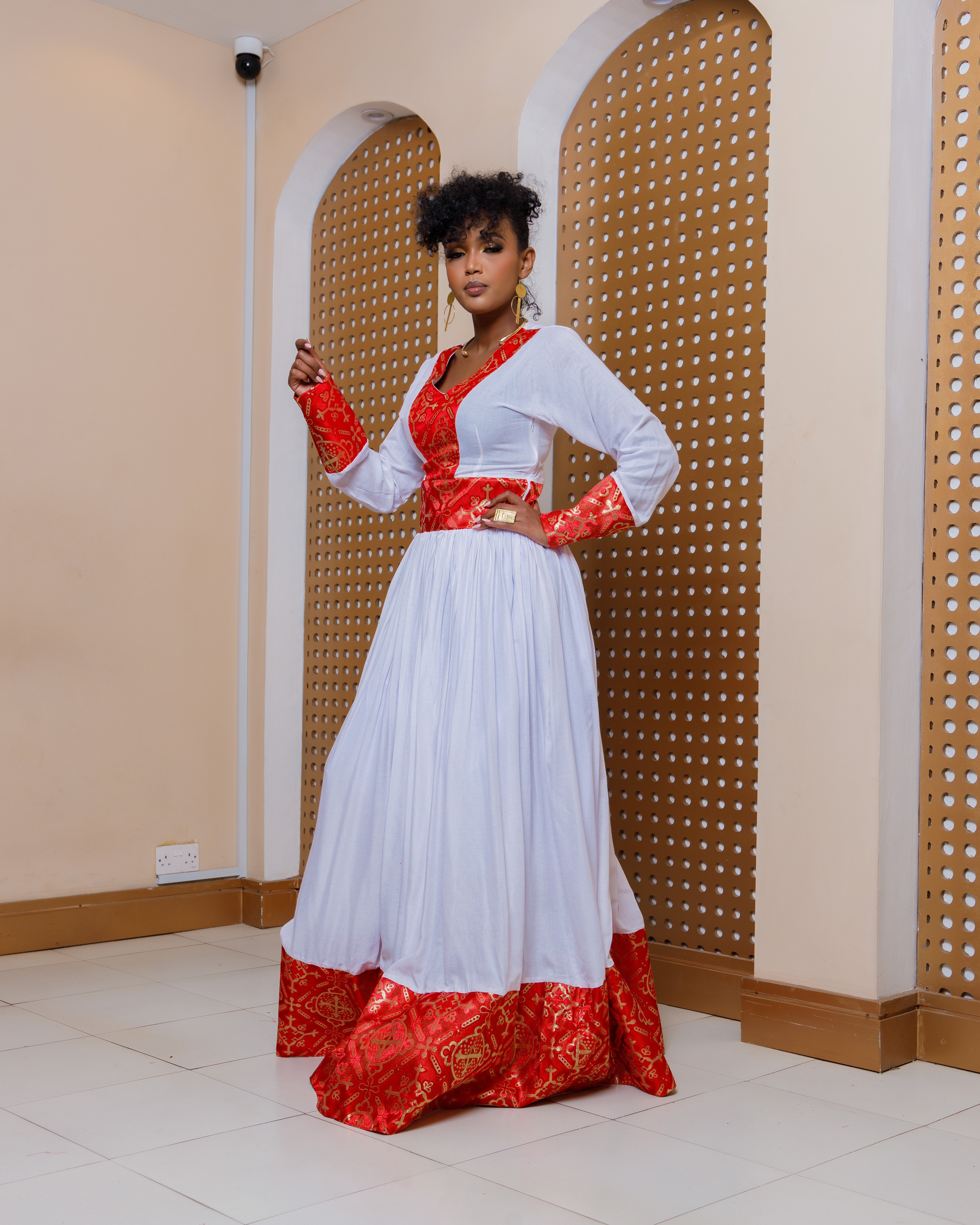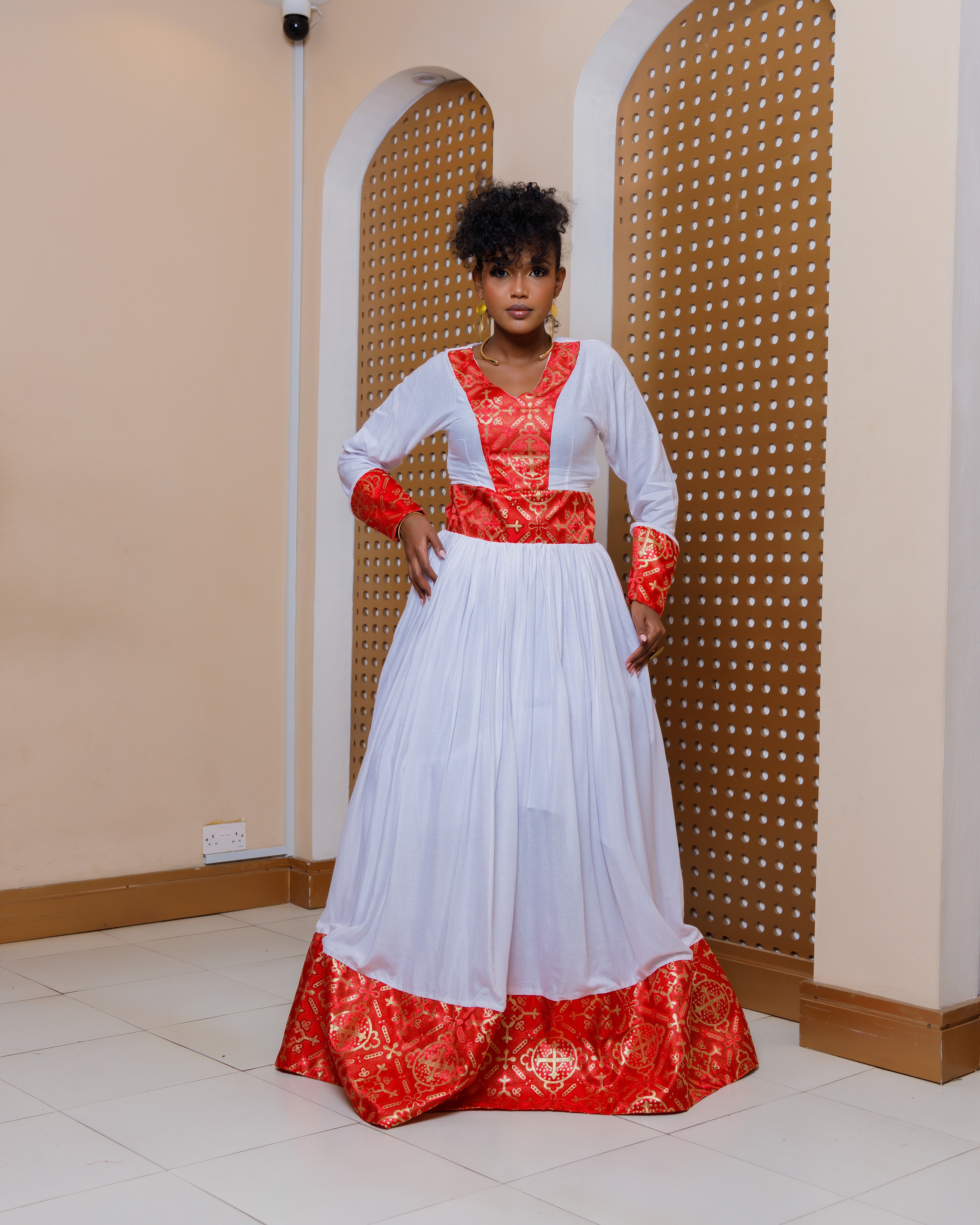 • The Ethiopian traditional dress is a stunning blend of white and red Ethiopian fabric, beautifully crafted with intricate patterns that reflect the country’s rich cultural heritage. The flowing white fabric offers a clean, elegant base, while bold red accents bring warmth and vibrancy to the design. These striking colors are woven together with exquisite geometric and symbolic patterns, representing a fusion of modern style and timeless tradition. Ideal for both festive occasions and everyday wear, this dress celebrates the beauty of Ethiopian craftsmanship in a striking, yet graceful, fashion.