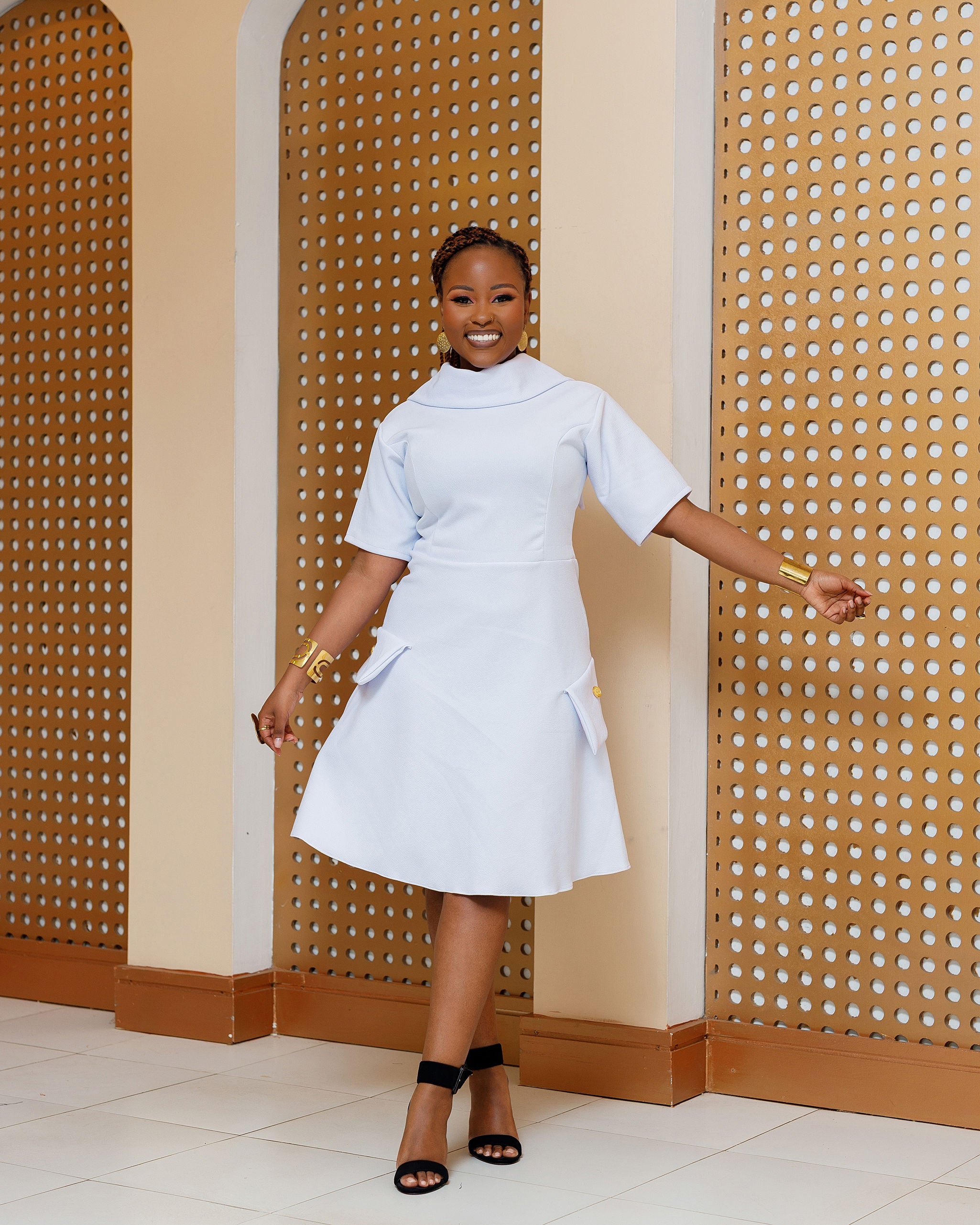 • A chic and feminine short dress designed to accentuate the silhouette with effortless elegance. The dress features a fitted bodice with a statement neckline, offering a touch of romantic charm. The waistline enhances curves while providing a comfortable, flattering fit. The skirt flares gently into an A-line shape, ending just above the knee to elongate the legs and add playful movement. Crafted from a high quality Slightly stretchy fabric.