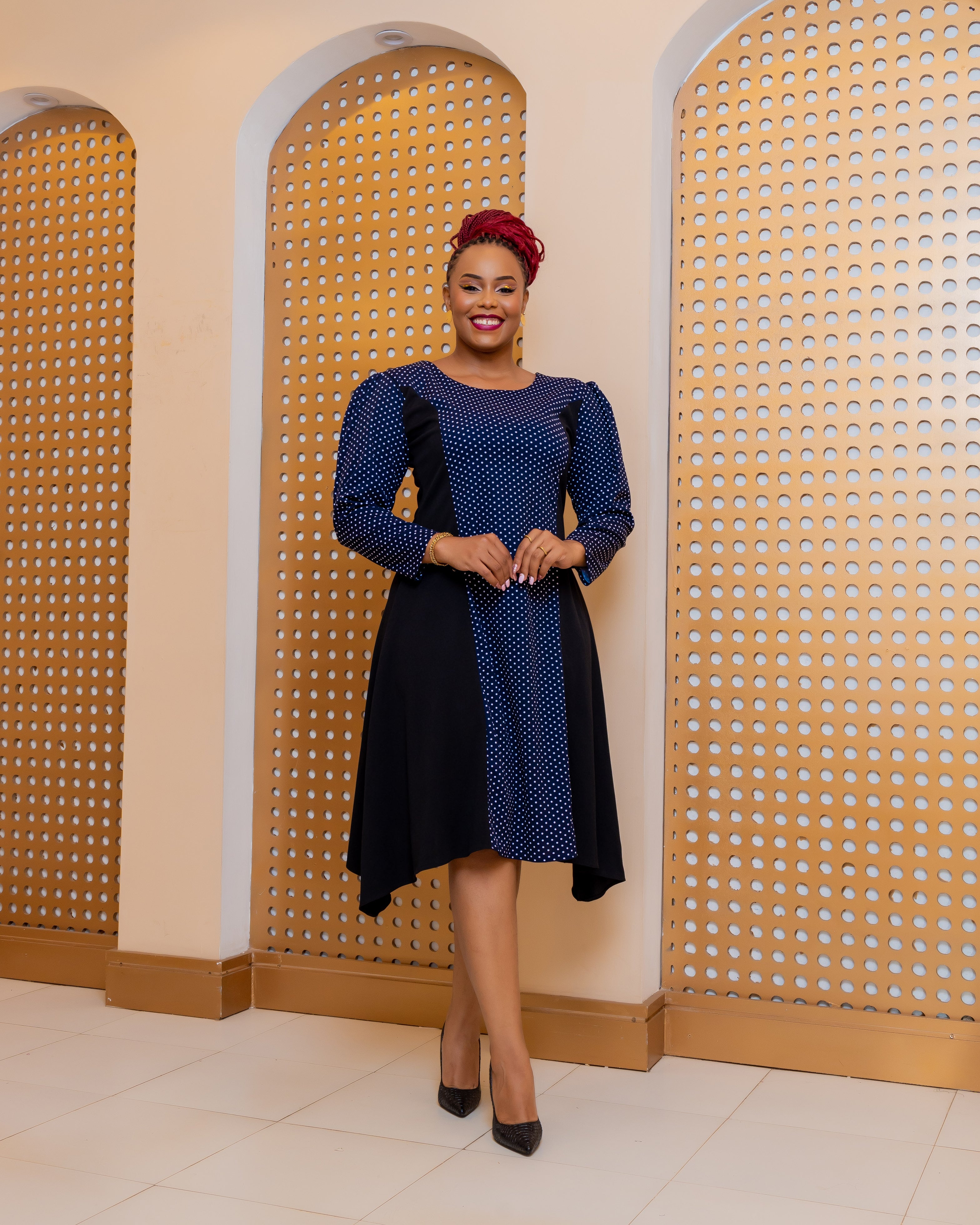 Stand out from everyone else in the office with this colour black formal dress with Navy Blue Polka Dots. Designed to flatter every body type and make you feel beautiful as you maneuver around the corporate world. Pair with some heels and a matching bag and you’re good to go! A dress that makes you look like the boss you already are.